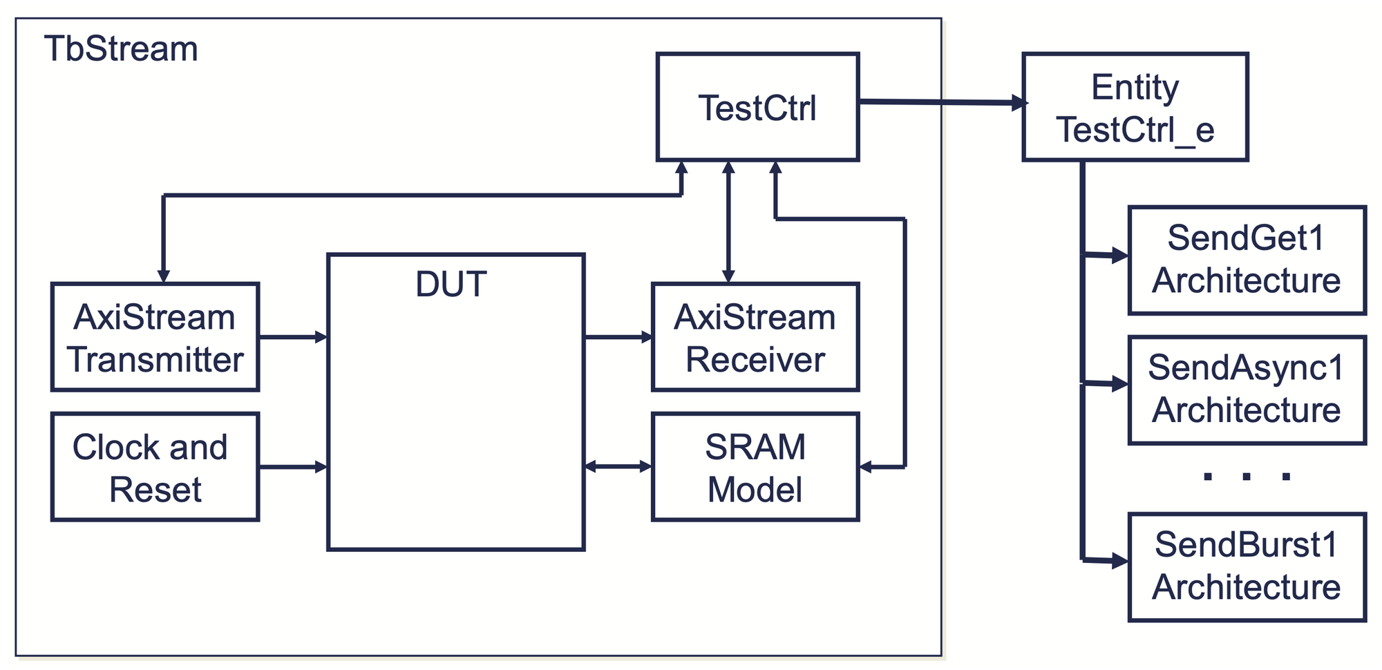 - The testcase architecture is described in the 'TbStream_SendGetRandom1.vhd' file in the 'OsvvmLibraries/AXI4/AxiStream/testCases' folder.
