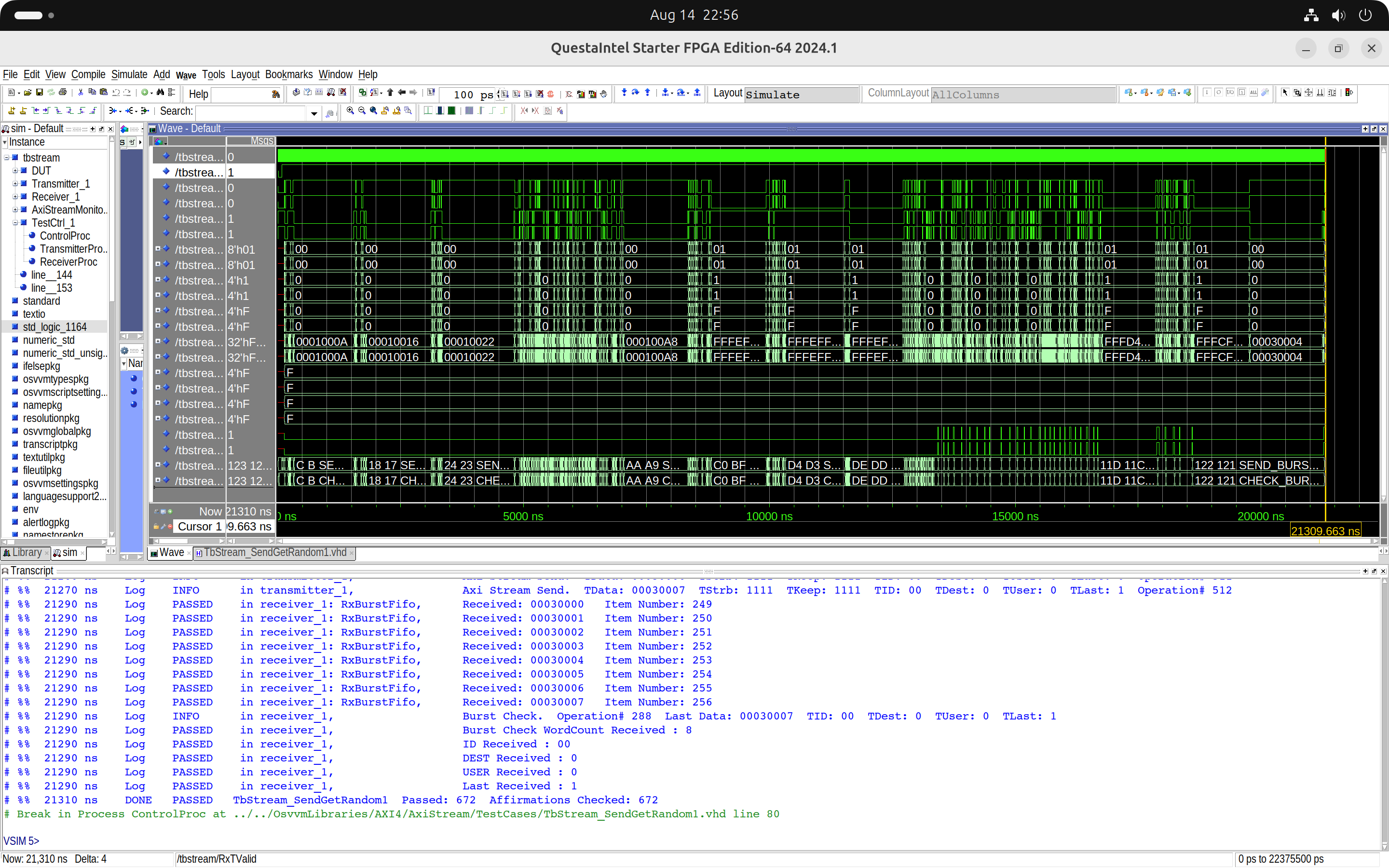 build ../../OsvvmLibraries/AXI4/AxiStream/RunTest.proWe can see in Questa's Transcript window that the simulation passed without errors. After adding the test bench signals to the wave window and restarting the simulation, we can also view the waveforms.