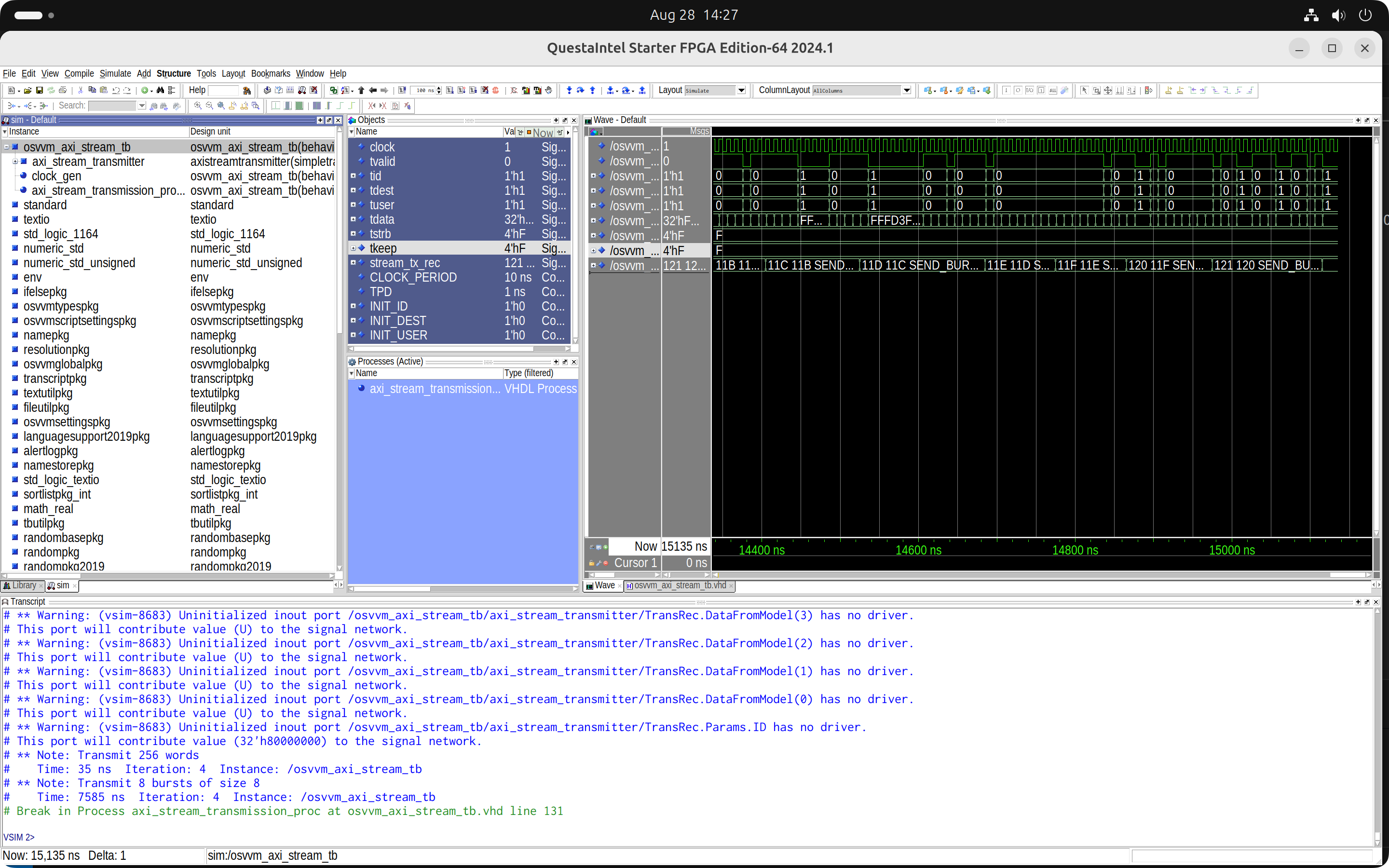 We can now run the simulation from Questa's command-line window. In the 'sim' panel on the upper left side, we can see that, instead of the example OSVVM testbench and test case, our minimal, single-file 'osvvm_axi_stream_tb' entity with the AXI-Stream Transmitter VC was simulated.