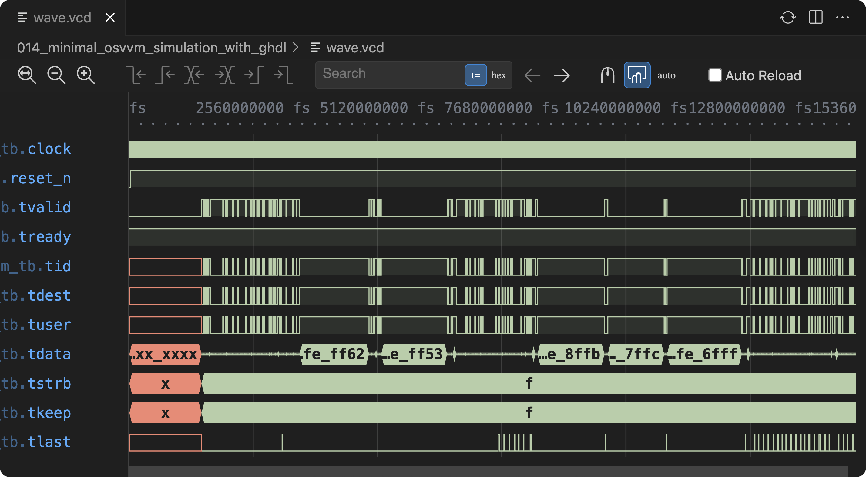 ghdl -r --std=08 -P=./VHDL_LIBS/GHDL-5.1.1/osvvm/v08/ -P=./VHDL_LIBS/GHDL-5.1.1/osvvm_common/v08/ -P=./VHDL_LIBS/GHDL-5.1.1/osvvm_AXI4/v08/ osvvm_axi_stream_tb --vcd=wave.vcdFinally, the waveform shows the results of our simulation.
