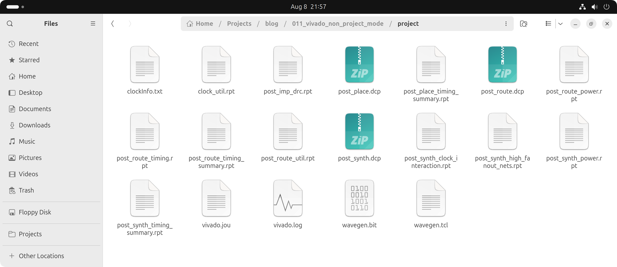 vivado -mode tcl -source wavegen.tclWe can see that the bitstream file has been created, along with the design checkpoints and reports for each stage of the process.