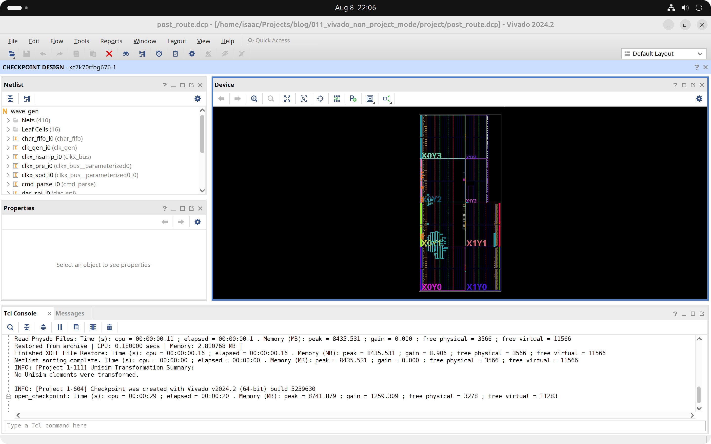 We can run the entire script at once by opening a terminal in the 'project' folder (where we have stored our non-project mode script as 'wavegen.tcl') and running Vivado in command-line mode:
